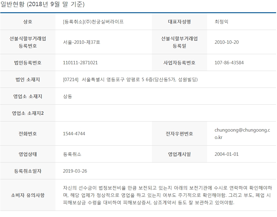 A. 천궁실버라이프(이안상조)는 2019-03-26에 등록취소됐습니다.