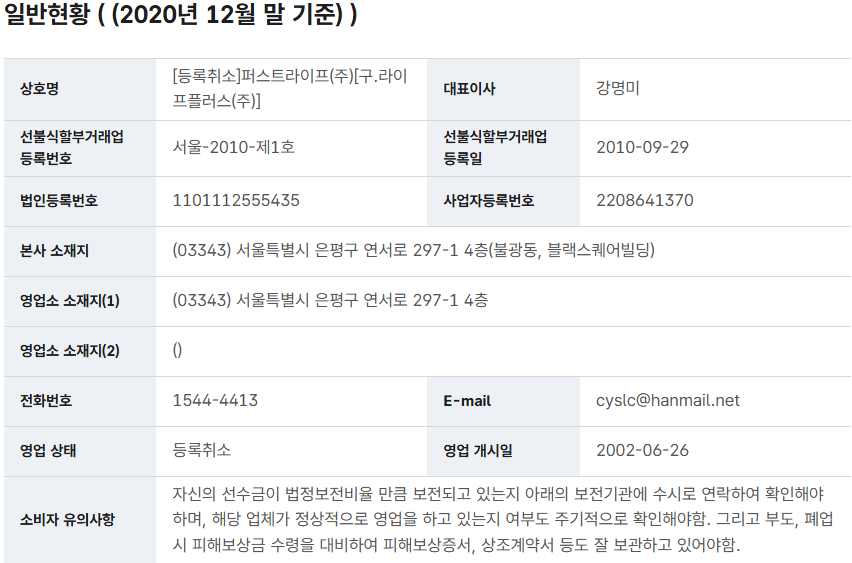 ⊙퍼스트라이프[라이프플러스,상조마스터], 서울 : 등록취소2025-02-00, 우리은행 20%