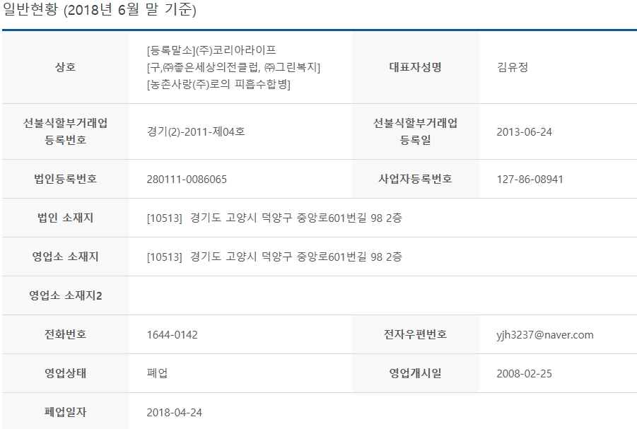 A. 코리아라이프(좋은세상의전클럽, 그린복지)는 농촌사랑으로 피흡수통합됐습니다.