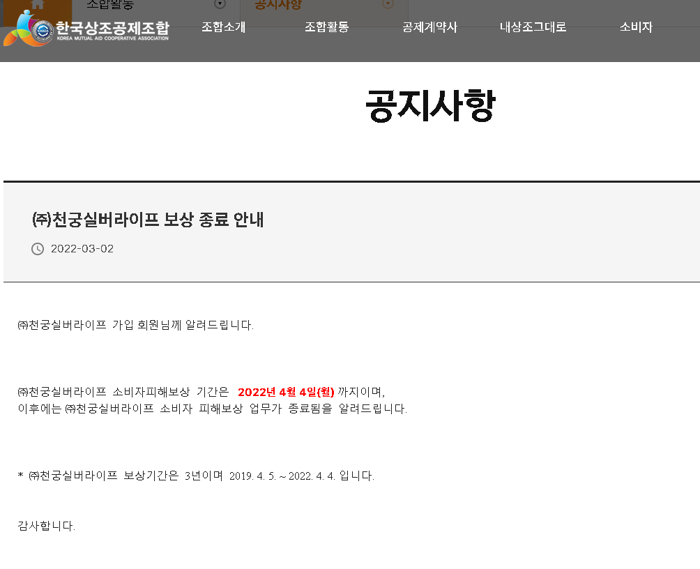 2019-03-26,㈜천궁실버라이프[이안상조],한국상조공제조합 2022-04-04피해보상종료